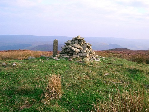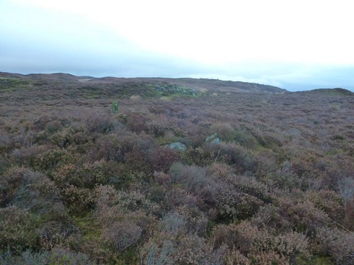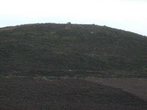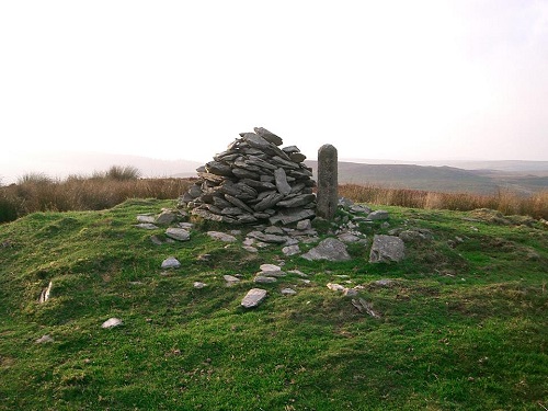 Carregbica Cairn. Bronze Age round barrow, occupied by a modern cairn and boundary post. 9.8m x 10.7m. Map Ref: SN924 655
