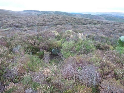 Glog Fawr Cairn, 6.4m in diameter, a Bronze Age round barrow with central cist. Map Ref: SN9248 6602